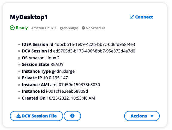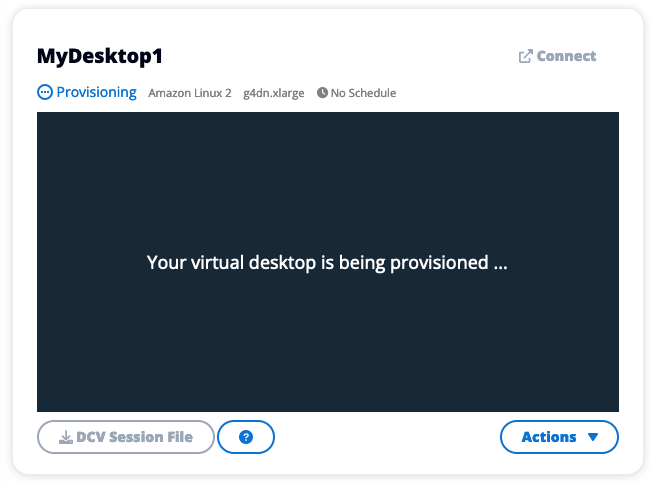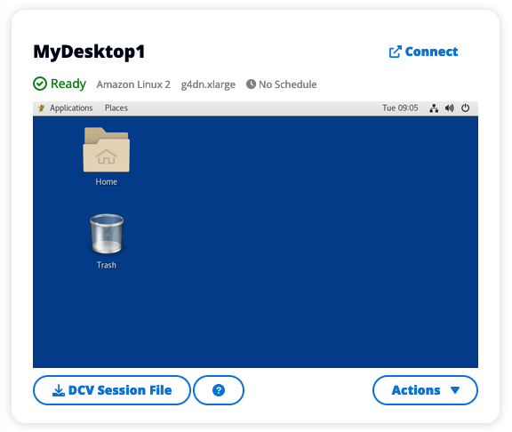 Once your virtual desktop is up and running, you can click the card and connect it either via web or DCV client.