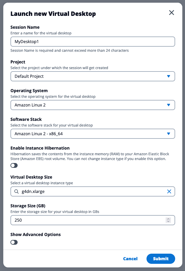 * **Virtual Desktop Size:** Instance type to provision. Select of EC2 instance types is based on the list of instances safe-listed by your cluster administrator and the project selected. You can change this value later without having to re-create a new desktop (see [modify-a-virtual-desktop](https://docs.idea-hpc.com/modules/virtual-desktop-interfaces/user-documentation/modify-a-virtual-desktop "mention"))
